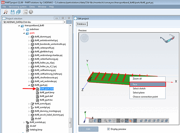 In the configurator [Configurator], select the individual part to be classified in the assembly (the belt in the case of a conveyor belt) and open it using the context menu command in PARTproject.