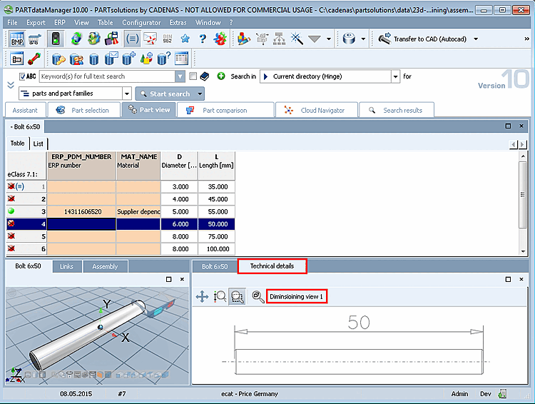 The dimensioning view can be selected and displayed later in the PARTdataManager in the Technical specifications [Technical details] dialog area.