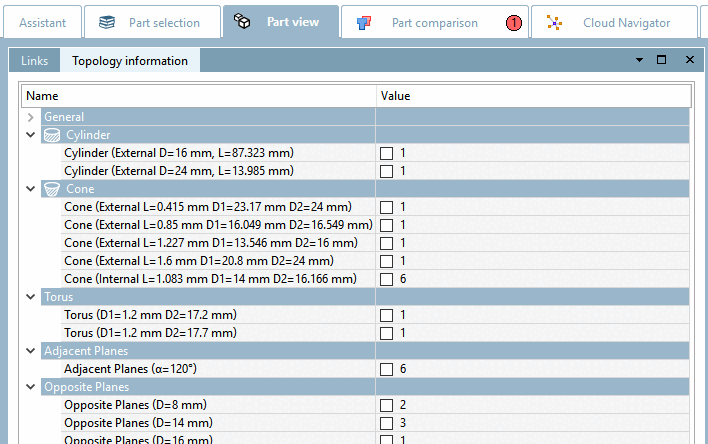 The depiction of the individual topology [Topology] features in part comparison [Part comparison] and part view [Part view] can be adjusted.