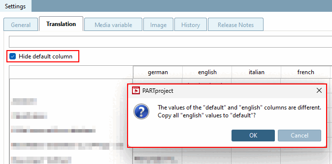 If you click OK, a comparison is made between the default [english] and the selected standard language columns. If there are differences, a window appears in which you can copy all terms into the default [english] column. If you cancel the process, all columns with different entries are highlighted in orange and you can rename them manually.
