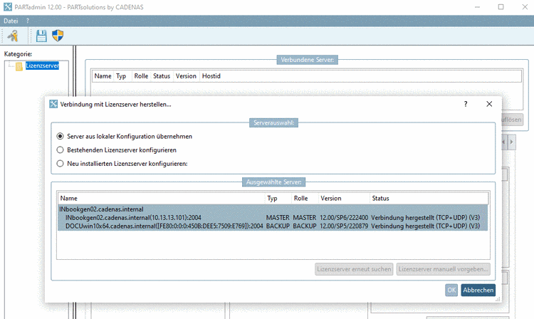 In the dialog area Connected servers, the single columns show information on Name, Type (Master | Backup | Passive), Role (Master | Backup | Passive), Status, Version and Host ID (all valid ones are stated, separated by "/", the first ID is the mac address).