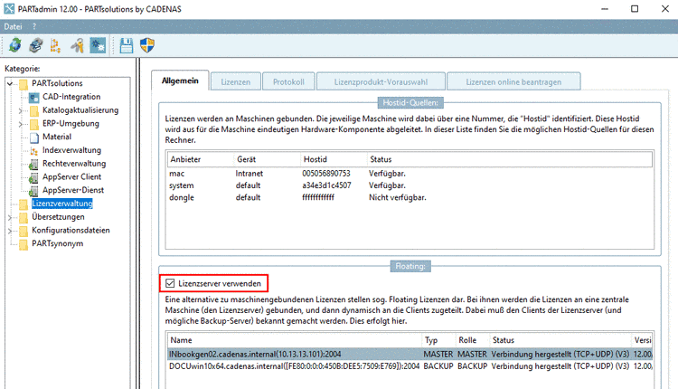 ... setup a Master-Backup cluster of license servers. Using a backup server is always recommended, in order to be able to go on working at a failure. In backup mode this is possible up to 12 hours. Even more secure is the usage of three license servers. In this way it is possible to work unlimited as long as two out of three are available.