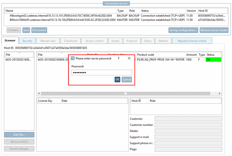 If a license has already been installed (this is the case at options Use server from client configuration and Configure existing license server, the dialog Please enter server password is opened.