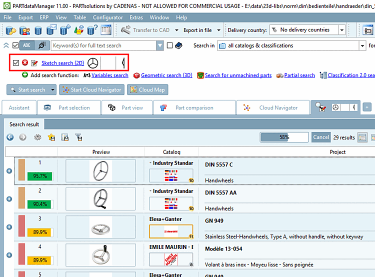 The sketch search (2D) [Sketch search (2D)] is useful if no reference part is available for a geometric search (3D) [Geometric search (3D)]. In a second step, the search may then be continued with Geometric search (3D) [Geometric search (3D)].
