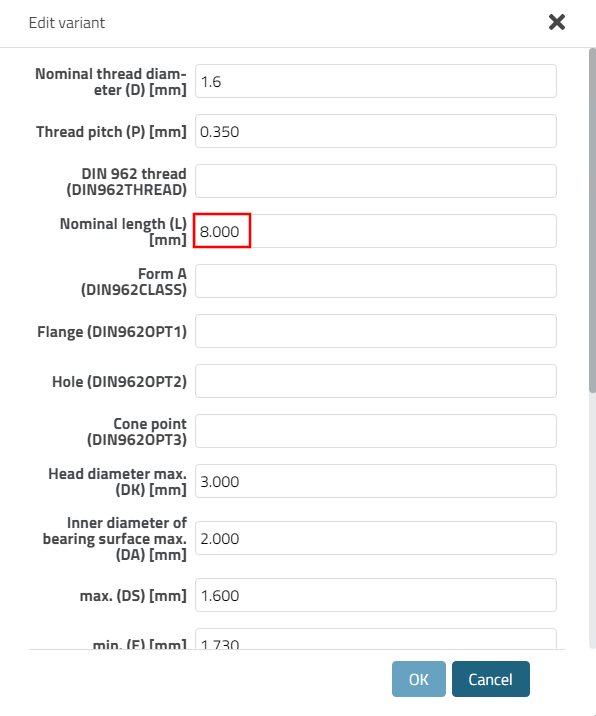 For example, change the value 8 from Nominal length (L) to 9, which does not appear in the characteristic attribute table, and confirm with .