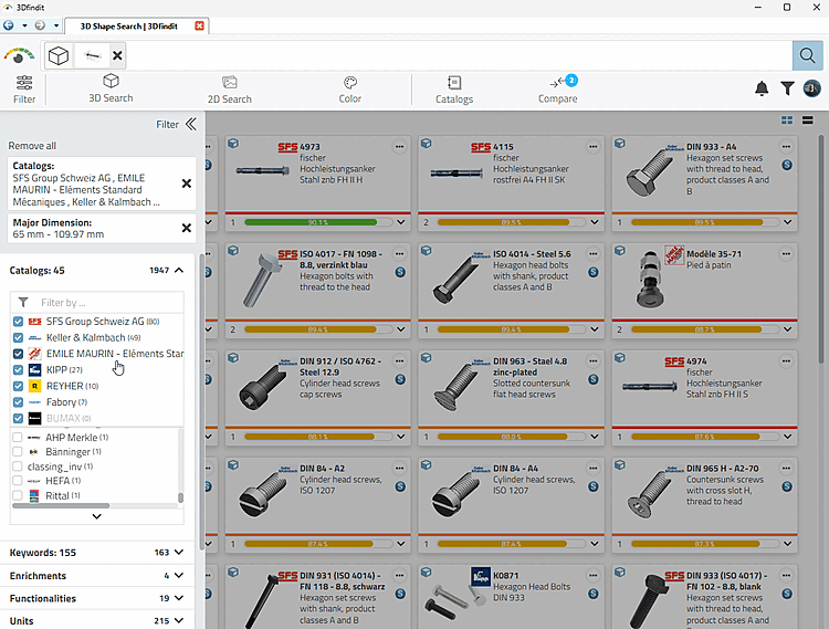 Comprehensive search [Broad search]: This search has better results on average, but a major disadvantage: Even with extremely similar parts, a similarity of close to 100% is not achieved.