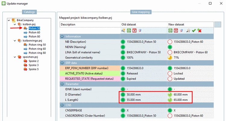 At piston 60 the parameters D and L are identical indeed, however, a geometrical deviation is signalized. In such cases open old and new version in Part comparison