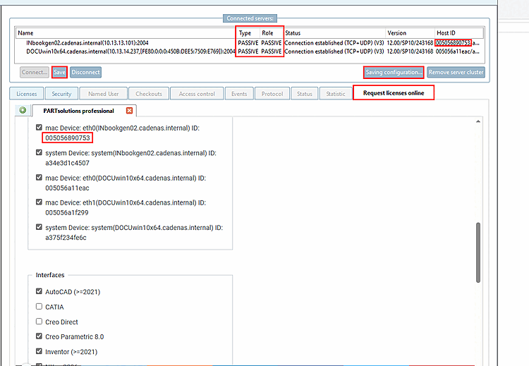 The network card addresses of each server and the required interfaces are already entered in the form. See also Section 1.5.4.12, “Tabbed page "Apply for licenses online"” in ENTERPRISE 3Dfindit (Professional) - Administration.