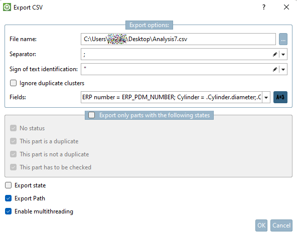 Activate multithreading [Enable multithreading]: Possibly useful to speed up the process for large files if table variables are to be included in the CSV. Activation should have a positive effect, especially with SSDs and network drives.