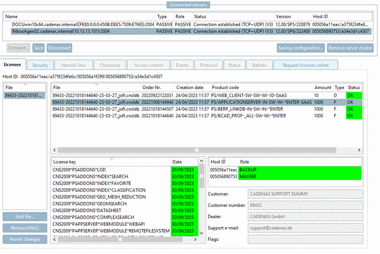 The chosen license servers are displayed in the dialog area Connected servers (Type and Role still on PASSIVE).