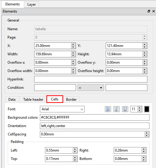 General: The general default settings can be found at Section 8.4.2, “General settings”. A special feature of tables is that the table on the overflow pages can be defined differently than on the first page.