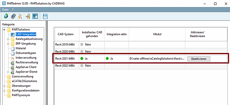 pcadmanager.cfg(CADENAS_SETUP), in the block [iface.revit], the key "Command_0" must contain theRevit.exeto the local installation.The used Revit version has to be activated under PARTadmin -> CAD integration -> Revit XY Version -> .