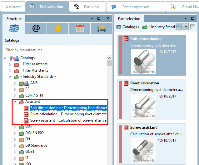 Calculation assistants display calculation results on the fly when entering parameters and this way support part selection.