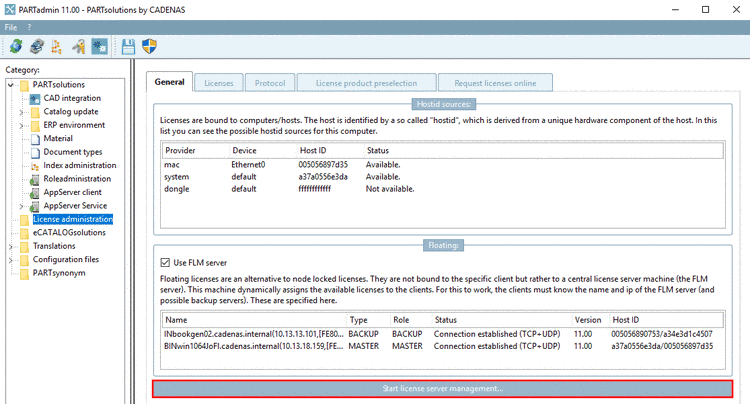 Start the License Server license administration in your installation (e.g. PARTsolutions Enterprise) in PARTadmin -> category License administration by clicking on the button Start license server management....