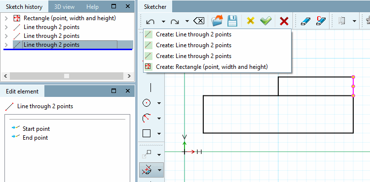 Removes the last created construction step from the sketch history [Sketch history] or from the drawing in the Sketcher.