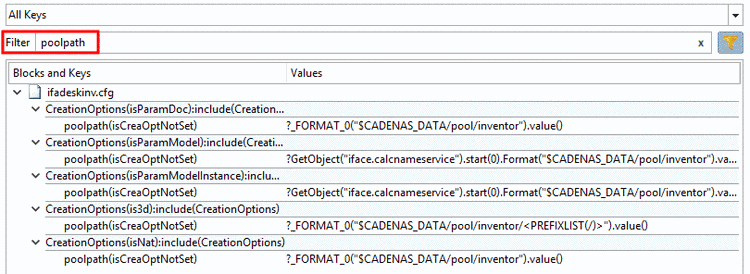 Searched are names of configuration files, blocks, keys and key values. The search term may occur at any place (at the beginning, at the end, in the middle).