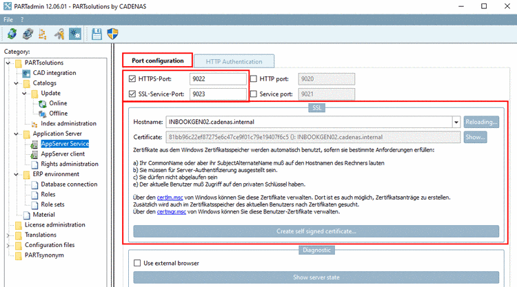 If the checkboxes HTTPS-Port and/or SSL-Service-Port are activated, the dialog area SSL is also activated.