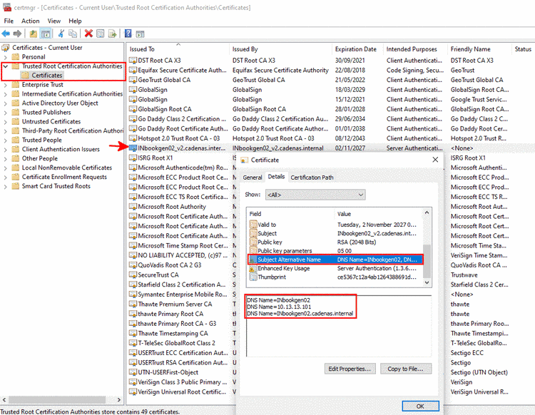 The standard Microsoft certificate management is completely supported and the regular management interface is displayed.