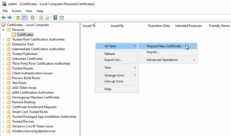 3. On the right, open the context menu and there, under "All Tasks" click on the command "Request New Certificate...".