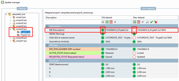 If in a project the standard name (NB) has been changed, then in the section Catalog all project lines, the project itself and the superordinated directory are marked with the orange exclamation mark . The exclamation mark overlays the respective base symbol (directory , project , line ).
