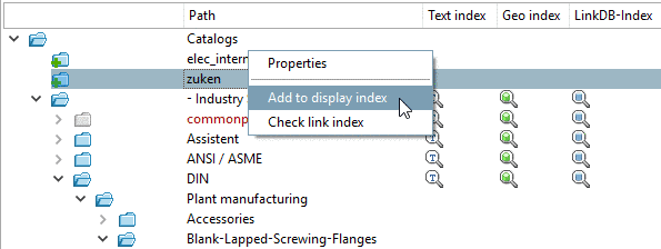 The display index is needed for saving or display of the directory structure. It has to be available in order for catalogs to be displayed in PARTdataManager. Other indices are optional for PARTdataManager functionality (however, useful in order to be able to use both Full-text search and the different geometrical search methods).