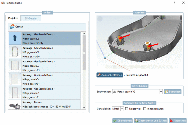 This command is only available at project level. The respective part is transferred to the Cloud Navigator as root node and then directly the search method Geometric search (3D) is performed.