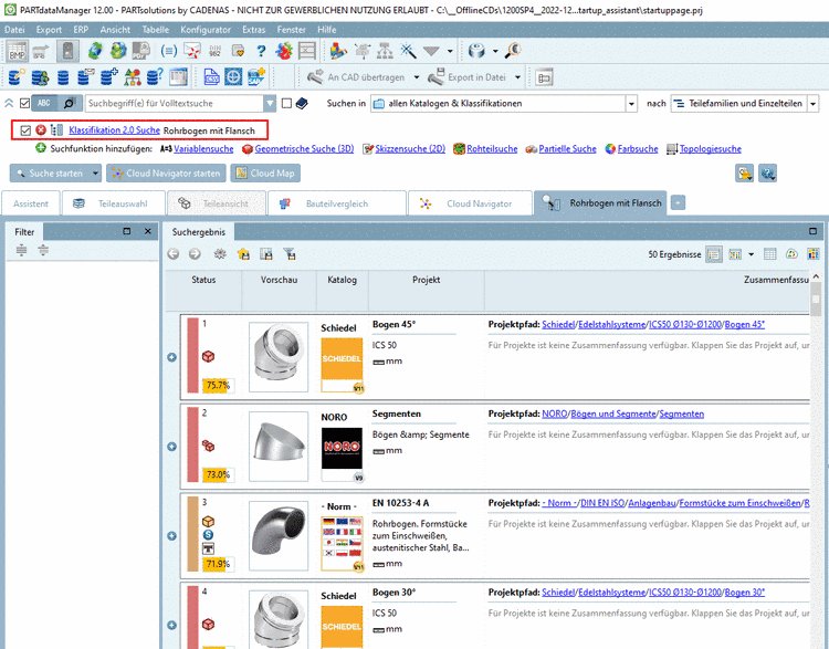 In the index tree, select a fitting Class 2.0 own part (in this example "Rohrbogen mit Flansch").