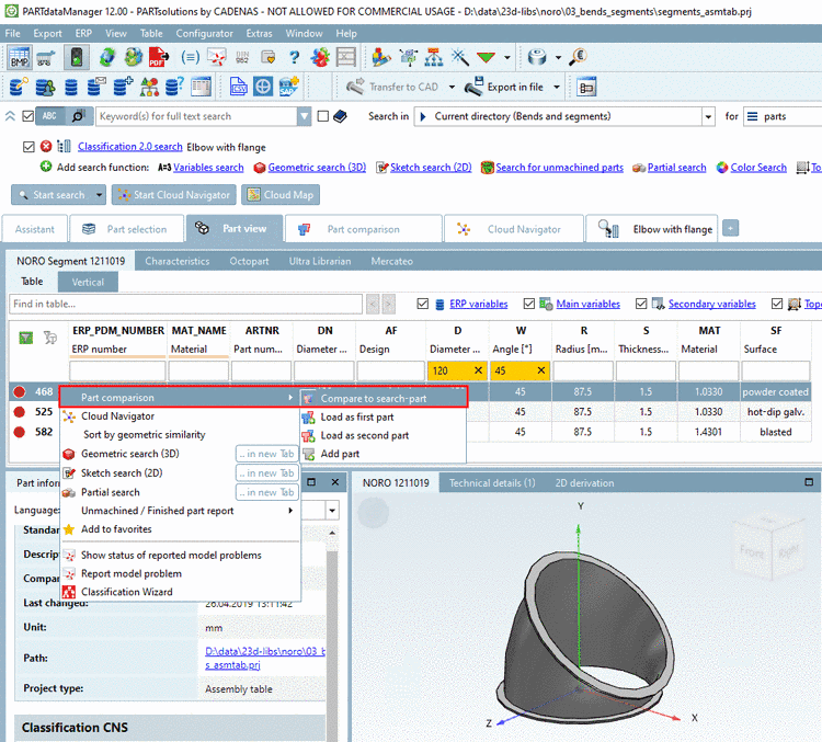 In order to perform a part comparison with the search part (or other parts in question) select the desired line and call the context menu command Compare to search-part.