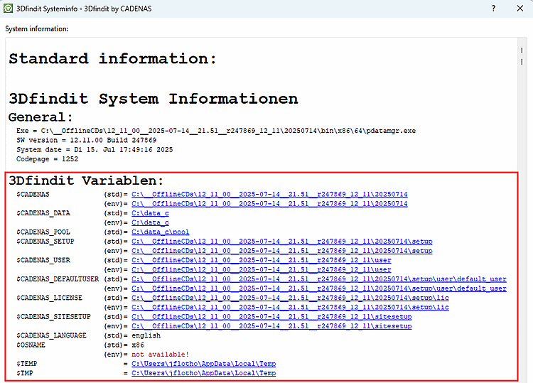 Open the 3Dfindit Systeminfo - 3Dfindit by CADENAS dialog window via the Help menu [Help] -> Systeminfo/Support [System info/Support], where you will find the 3Dfindit variables with the current path. You can quickly access the corresponding directories via the variable links. However, you must have the necessary administration rights.