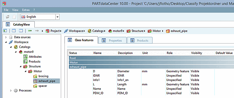 After selecting a class in the structure view [Structure], the tab pages Class characteristics [Class features], Products and Properties are displayed on the right.
