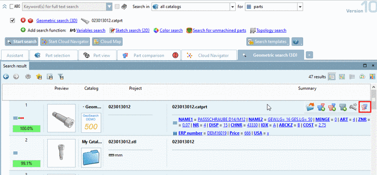 In the 3D tooltip of the result list the bounding box[58] of the search part is also displayed (analogously to the red bounding box in the 2D quick compare).