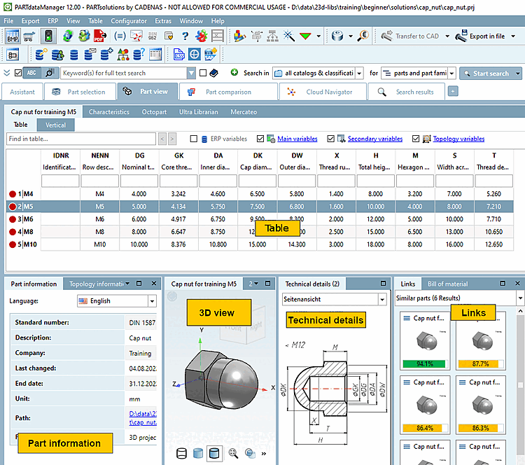 The following illustration shows the cap nut in PARTdataManager in the parts view [Part view].