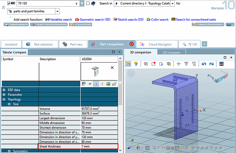 You can also see the topological characteristic material thickness [Material Thickness] in the component comparison [Part comparison].