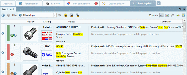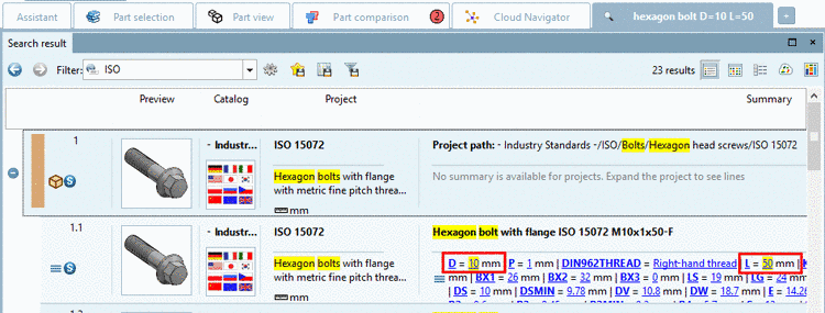 Hits based on table values are marked in yellow on the tabbed page Search results as well. In the following example a search for "hexagon bolt D=10 L=50" has been performed.