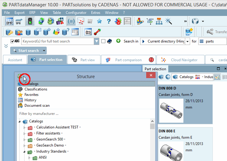 Calling up the parts view [Part view] is optional. Specific characteristics can already be determined in the Parts selection [Part selection] dialog area.