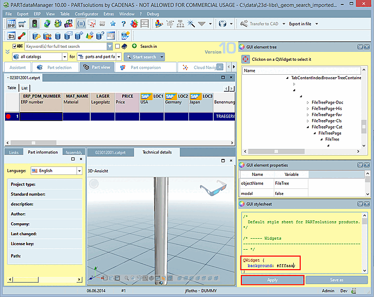 Under $CADENAS_SETUP/styles, the default.css file is used for the GUI style.