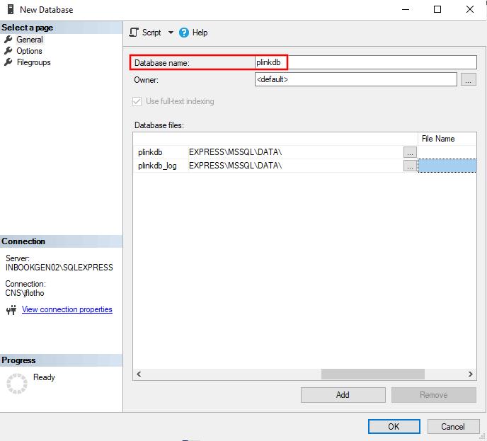 plinkdb_reuse.sql(at..\tools\databases\MSSQL) as a template.USE [master] GO CREATE LOGIN [erpuser] WITH PASSWORD=N'erpuser', CHECK_EXPIRATION=OFF, CHECK_POLICY=OFF GO CREATE DATABASE [plinkdb] ON ( FILENAME = N'<DBFILE>' ), ( FILENAME = N'<DBLOGFILE>' ) FOR ATTACH GO if not exists (select name from master.sys.databases sd where name = N'plinkdb' and