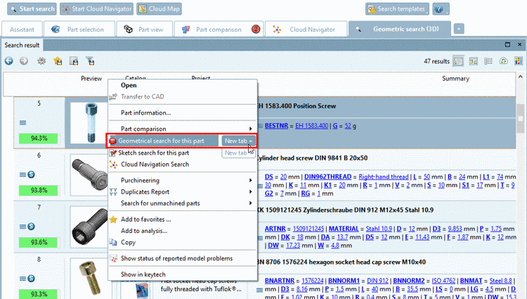 You can also find the context menu command Geometrical search for this part in the directory structure of the following tabbed pages: Catalogs, Classes, Favorites, History and Analyses.