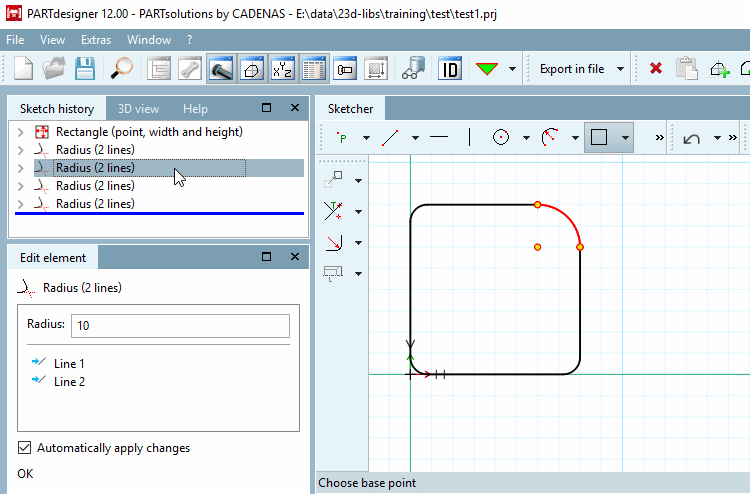 function.You can now also make changes to individual fillets (or several). Select the desired ones in the sketch history [Sketch history] or in the Sketcher.