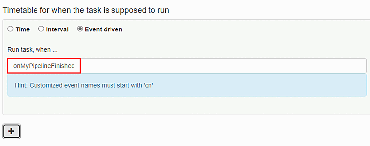 For a desired follow-up task, select the Event-based option under Schedule when the task should be executed and enter the exact name defined previously. (The follow-up task can be any task, not just RunPipelineTask )