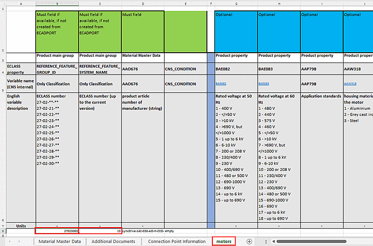 In the Excel file, in the corresponding product-specific data sheet (in the figure below "motors" as an example), under REFERENCE_FEATURE_GROUP_ID (column B), the corresponding class according to which the classification is to be made must be entered. The following figure shows "27023003".