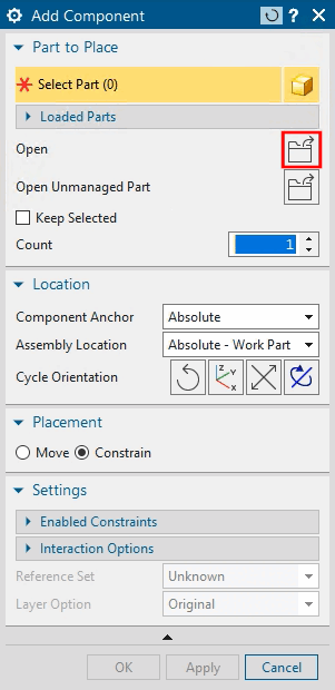 Open the list field under Assembly Location and select Absolute - Work Part.