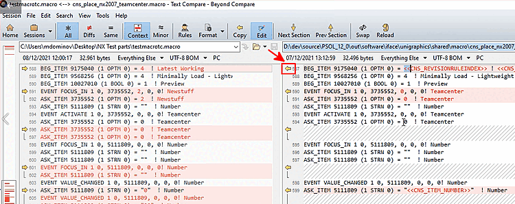Transfer these lines into the recorded macro with the help of the used comparison tool; in above figure by clicking on the yellow arrow.