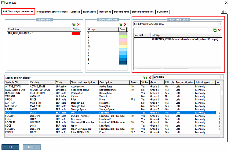 Setting in user interface under PARTlinkManager -> Extras menu -> Configure dialog -> PARTlinkManager settings [PARTlinkManager preferences] tab page -> Adjust table values -> Set bitmap (only PDataMgr) [Set bitmap (PDataMgr only)]