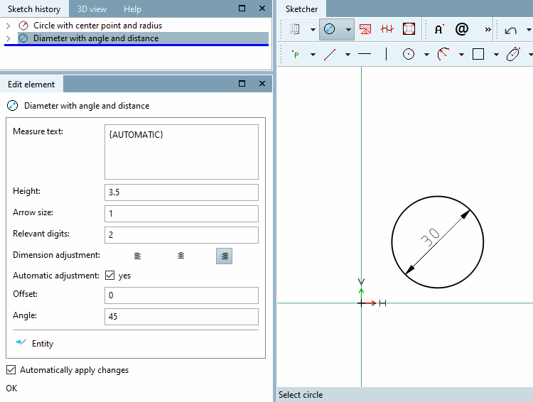 Select circle: Click on the circle to be dimensioned. --> The dimension line appears.