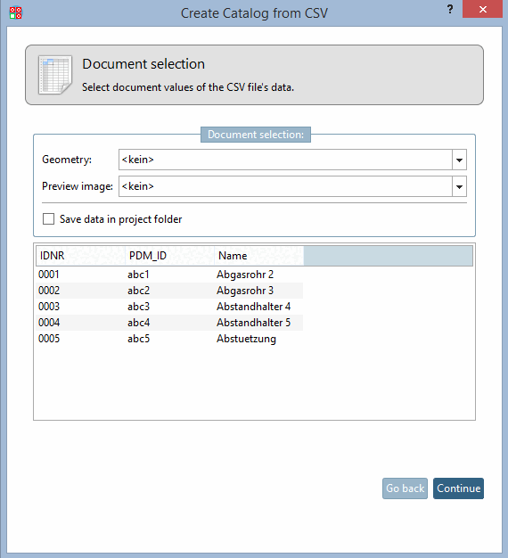 Geometries, preview images and technical views can be added in further working steps. On this see Section 1.3.5.3, “ Edit documents in product ”. If the table contains the PDM document number (in the above example "PDM_ID"), the PDM documents can be automatically accessed and respective processes be triggered via scripting solutions.