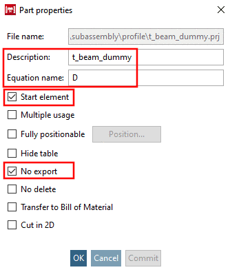 From the directory .../partsolutions/23d-libs/training/subassembly/profile insert the dummy starter part and in the dialog box Part properties perform respective entries.