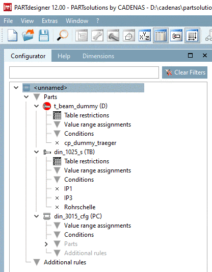 -> Now in the Configurator, the parts dummy starter part (D), double T-beam (T) and pipe clip (PC) are displayed.