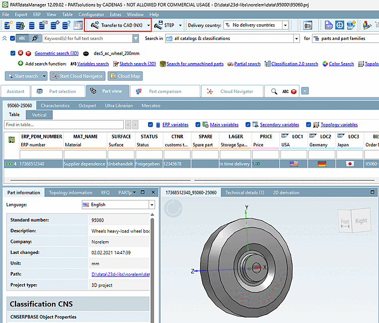 The geometric search (3D) [Geometric search (3D)] is suitable for text-independent searches, also as a supplement to the full text search, especially for searching in the own parts pool, for unclassified parts or parts that are not recorded in ERP/PDM. Thanks to its precision, you can find the proverbial needle in a haystack.