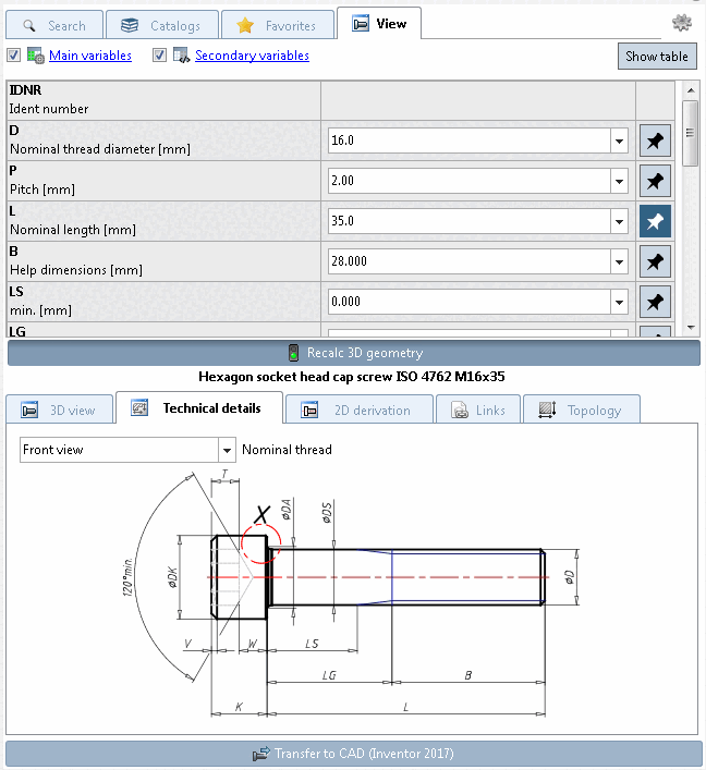 On the Technical data [Technical details] tab page you will find dimensioning views [Dimensioning views] (e.g. front view [Front view], side view [Side view] ) and display modes [Display mode] (e.g. nominal thread [Nominal thread] or core hole [Core diameter] ).